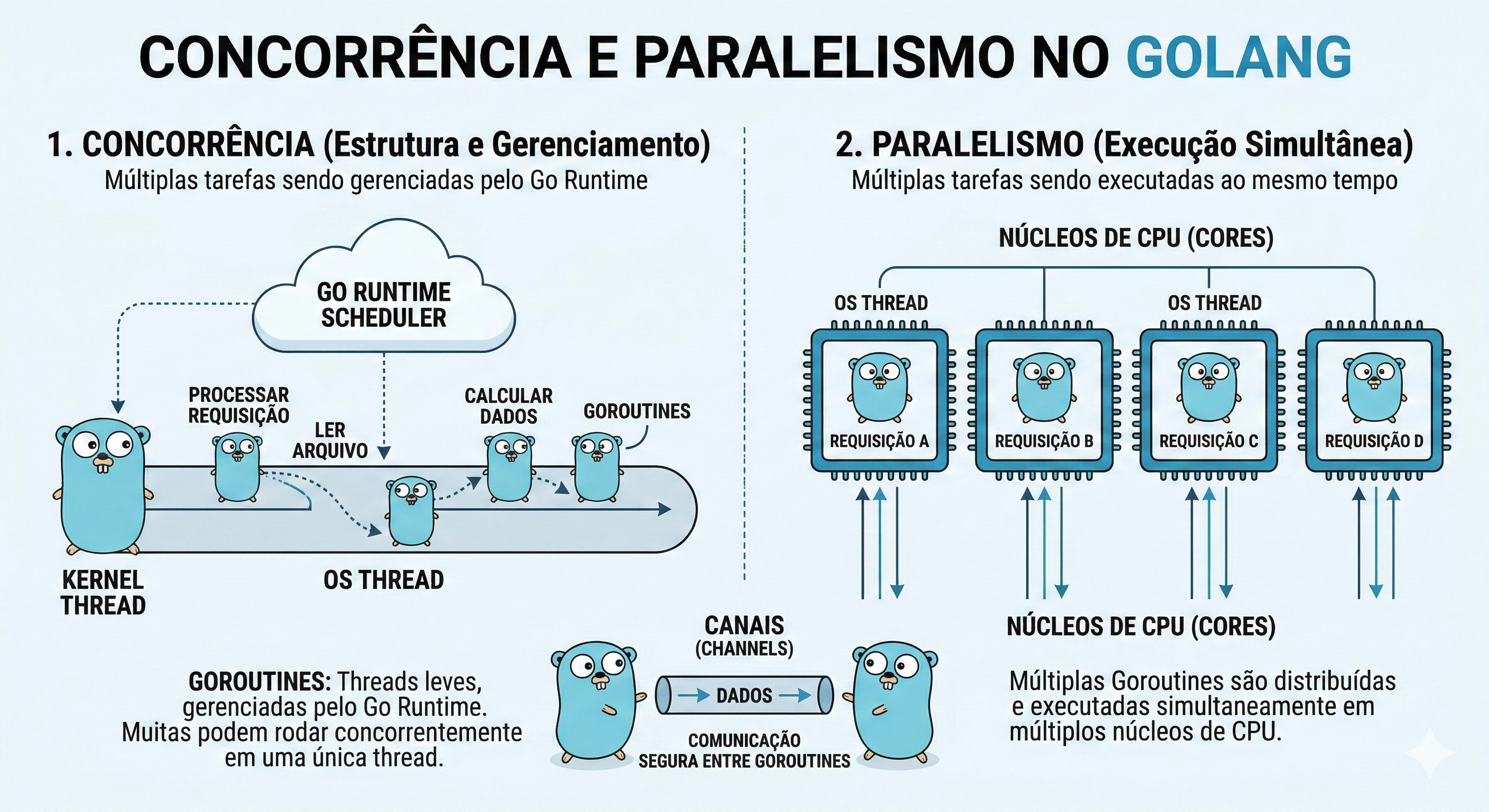 Dependendo do contexto, concorrência pode ser confundida com paralelismo e, de certa forma, o Go (Golang) mistura muito bem esses dois conceitos.