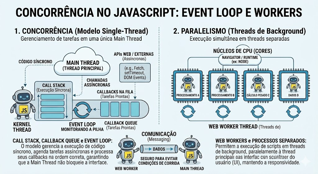 });Por fim, é possível realizar paralelismo real em JavaScript por meio de Workers. Nesse modelo, o código é executado em threads separadas, cada uma com seu próprio contexto de execução. No entanto, não irei me aprofundar nesse tema aqui, pois pretendo escrever um texto específico sobre Workers.